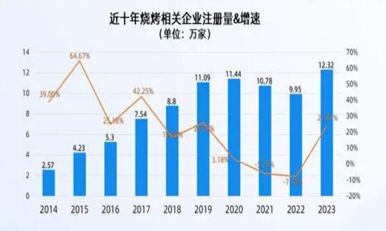 企查查数据显示,国内现存烧烤相关企业55.07万家。近十年,其注册量呈整体增长态势。借淄博烧烤火热出圈等流量,2023年注册量达12.32万家,同比增长23.81%,其中,淄博市注册量同比增长29.53%至737家,超全国增速。