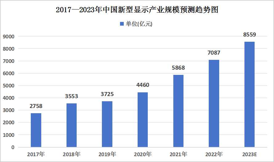 图表:2017—2023年中国新型显示产业规模预测趋势图