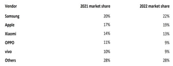 2022年全球智能手机出货量为12.1亿部,这是自2013年以来的最低年度出货量,原因是消费者需求大幅下降和经济不确定性。从2022 年全年来看,三星以22%的出货量份额排名第一,相比上一年份额提升了2%,而2022年Q4则是以20%的份额排名第二,份额相比上一年提升1%。
