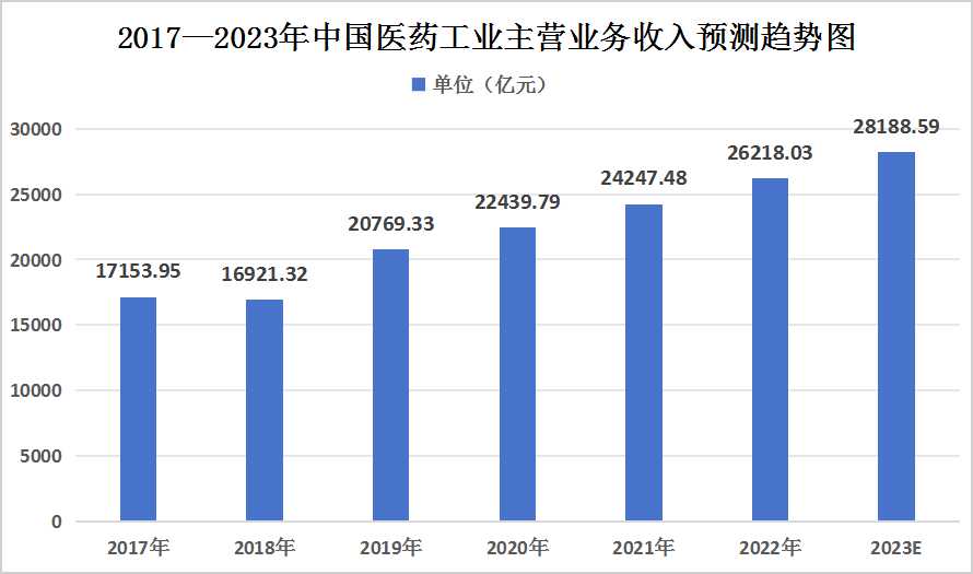 图表:2017—2023年中国医药工业主营业务收入预测趋势图
