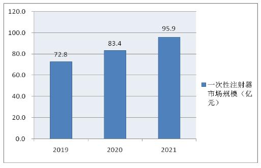 图表:2019-2021年中国一次性注射器行业市场规模(单位:亿元)