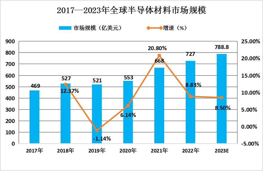 图表:2017—2023年全球半导体材料市场规模预测趋势图