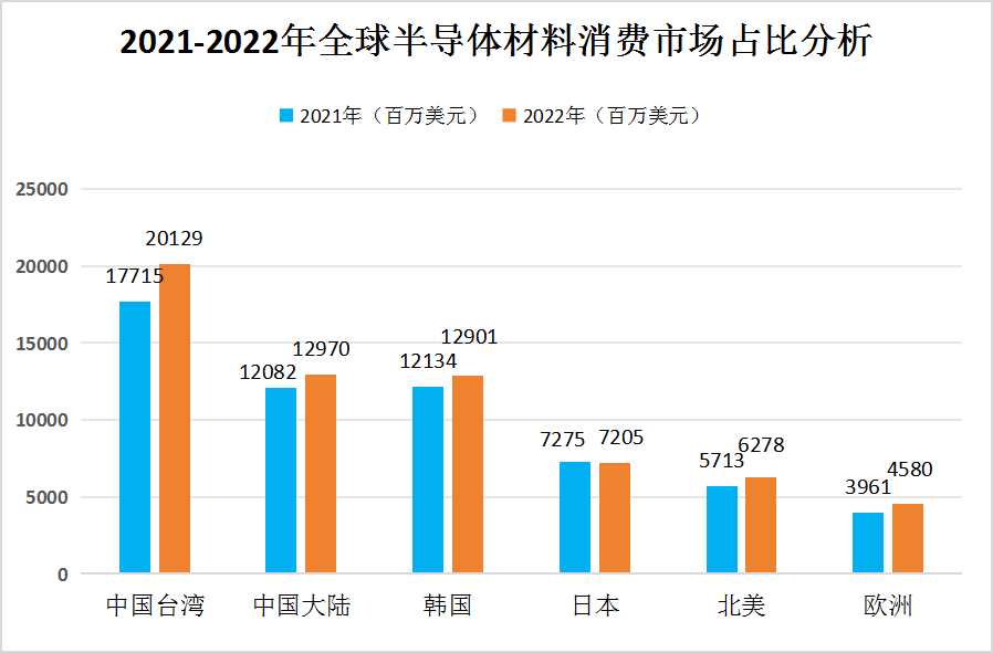 图表:2021-2022年全球半导体材料消费市场占比分析