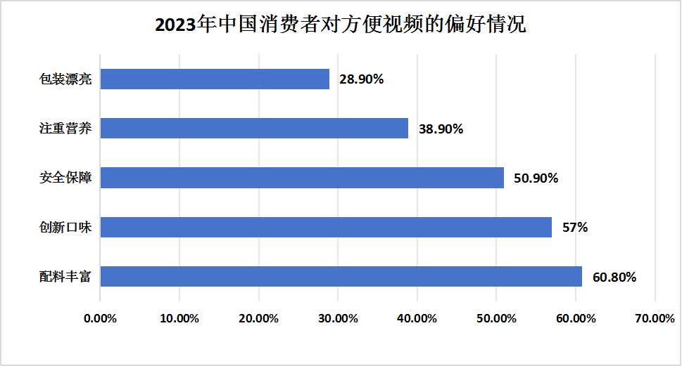 同时,我们还发现中国消费者对方便食品的未来改良方向有着明确的期望。其中,配料丰富是消费者最为关注的一个方面,占比高达60.8%。这意味着,在追求方便快捷的同时,消费者也希望方便食品能够提供更丰富、更全面的食材选择,以满足他们的味蕾需求。