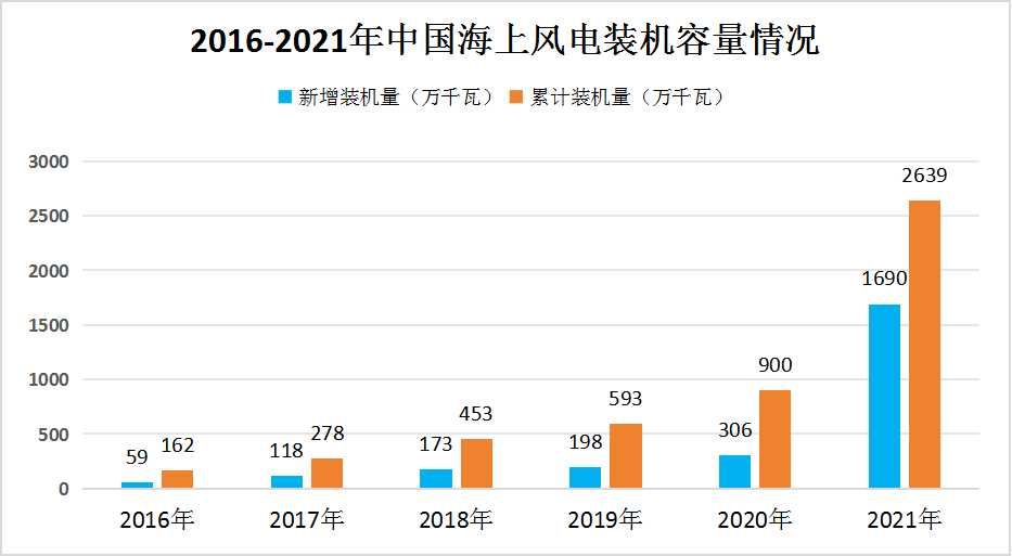 近年来,中国海上风电行业呈现出迅猛的发展态势,装机容量不断攀升。随着技术的不断进步和市场的逐步成熟,越来越多的资本和资源被投入到这个领域,推动着行业的快速扩张。2021年,中国海上风电累计装机容量达到了2639万千瓦,新增装机更是高达1690万千瓦,这一数字不仅彰显了我国海上风电产业的强大实力,也预示着未来更加广阔的发展前景。