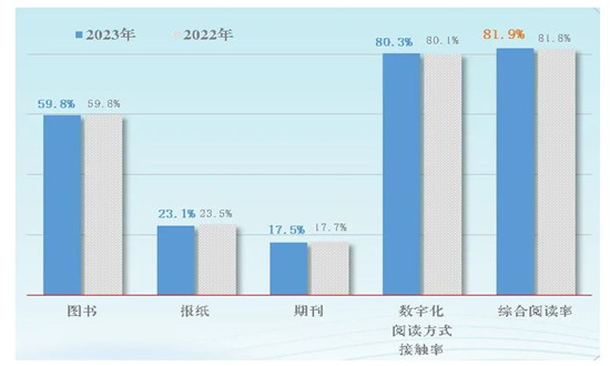 第21次全国国民阅读调查结果23日发布。调查显示,2023年我国成年国民包括书报刊和数字出版物在内的各种媒介的综合阅读率为81.9%,较2022年的81.8%提升了0.1个百分点。