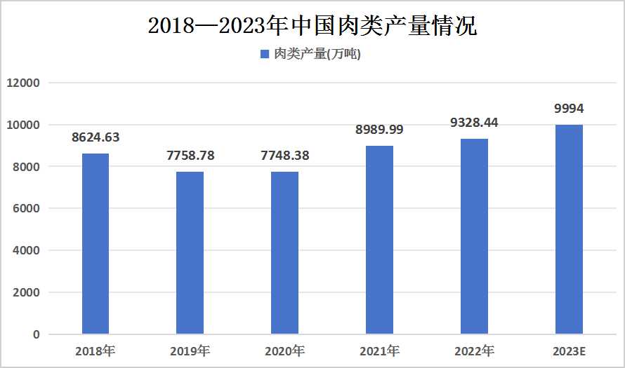 进入2023年,我国肉类产业继续保持增长态势。上半年,全国猪牛羊禽肉产量达到了4682万吨,同比增加了164万吨,增长率为3.6%。这一趋势预示着今年全年肉类产量有望再创新高。据预测,2023年我国肉类产量将达到9994万吨,比上年增长1.1%,进一步巩固了我国在全球肉类市场中的领先地位。