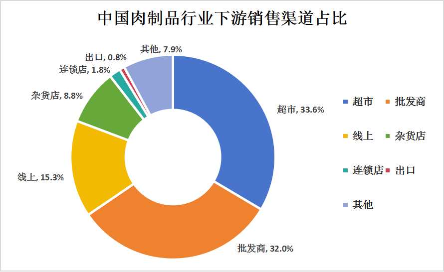 肉制品产业链下游的销售渠道呈现多元化趋势,涵盖了餐饮店、超市、连锁店、菜市场、批发市场以及线上平台等多个领域。在这些销售渠道中,超市和批发商以其广泛的覆盖面和高效的流通体系,占据了销量占比的领先地位,分别达到了33.6%和32%。