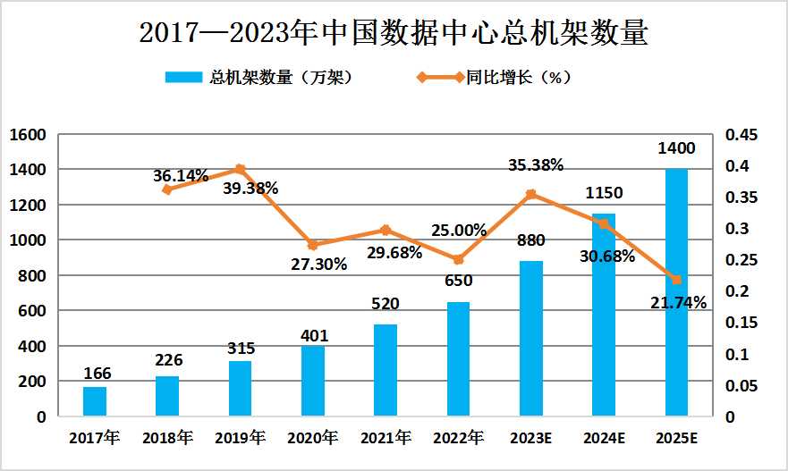 图表:2017—2023年中国数据中心总机架数量