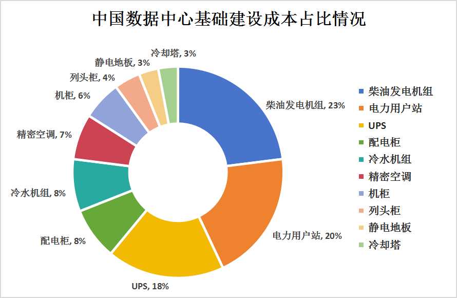 紧随其后的是配电柜、冷水机组、精密空调、机柜、列头柜、静电地板以及冷却塔,它们的成本占比分别为8%、8%、7%、6%、4%、3%和3%。这些设备和组件各自在数据中心运营中发挥着不可或缺的作用,共同保障着数据中心的稳定运行和高效能耗。