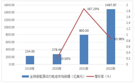 图表:2019-2022年全球新能源动力电池市场规模(亿美元)