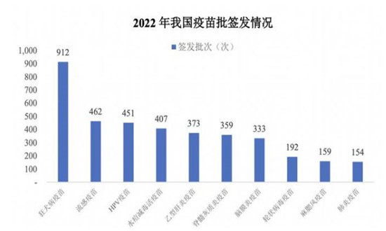 2022年全年狂犬病疫苗共完成批签发912批次,在各类疫苗产品中排名第一,狂犬病疫苗已经成为我国非免疫规划疫苗中批签发量最大的疫苗之一,属于用量大、成熟稳定的疫苗品种。