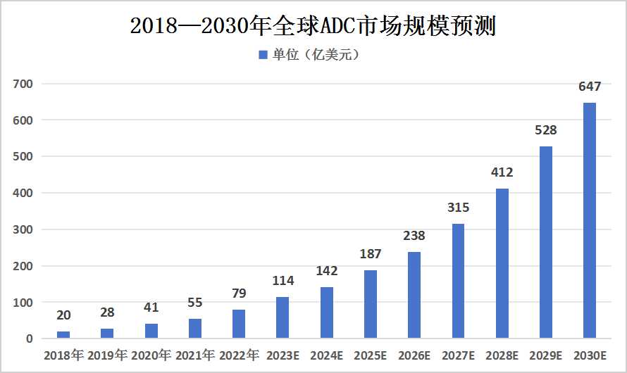 从市场角度来看,全球ADC市场预计将在未来十年内实现显著增长。根据最新数据,2022年全球ADC市场已达到79亿美元,并在2018年至2022年期间实现了40.4%的复合年增长率。展望未来,市场预测显示到2030年,全球ADC市场有望进一步增长至647亿美元,复合年增长率预计为30.0%。这意味着ADC市场将在未来几年内保持强劲的增长势头。