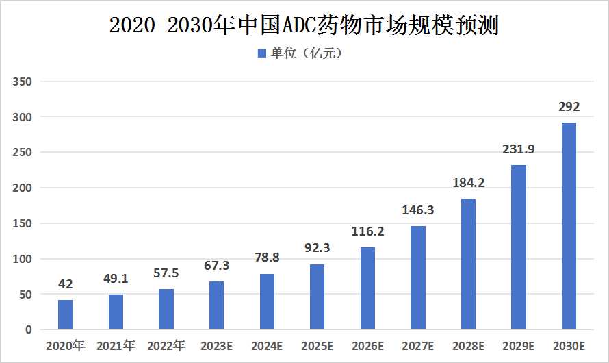 从需求端来看,中国ADC药物市场正在经历显著的增长。2023年的市场规模已经达到约67.3亿元人民币,这表明该领域的快速发展和市场接受度的提升。更令人期待的是,预计到2030年,中国ADC药物市场规模将达到292亿元人民币,显示出巨大的增长潜力和市场前景。