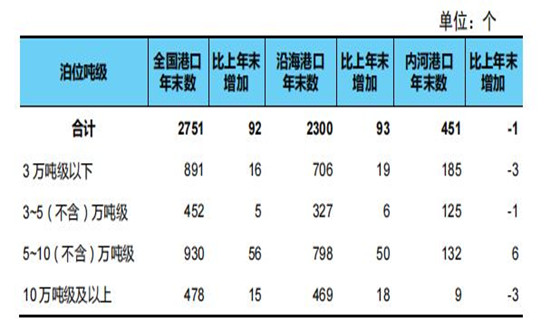 全国港口万吨级及以上泊位2751个,比上年末增加92个。从分布结构看,沿海港口万吨级及以上泊位2300个、增加93个,内河港口万吨级及以上泊位451个、减少1个。