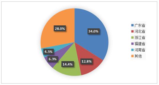 通过国内第三方工商注册信息查询机构--“企查查”查询“皮革”结果显示,通过选择“存续和在业,制造业:皮革、毛皮、羽毛及其制品和制鞋业”等选项,广东省行业企业占比第一,达到34%,浙江省、河南省为第二、第三,占比依次为14.4%,12.8%。
