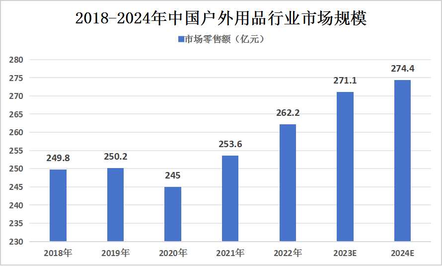 随着人们对于户外运动的热情持续高涨,预计中国的户外用品市场将继续保持增长态势。据预测,2023年中国户外用品零售额将达到271.1亿元,而到了2024年,这一数字有望进一步增长到274.4亿元。这充分展示了中国户外运动市场的广阔前景和巨大潜力。