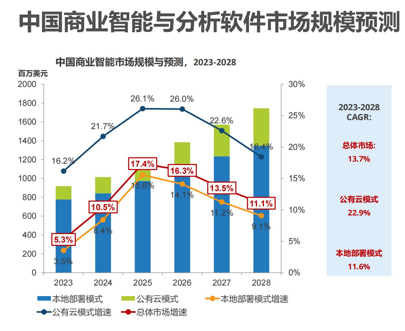当前我国商业智能软件BI行业处于从萌芽转向高速发展的过渡期,整体仍处在相对基础的发展阶段,但由于企业数字化转型驱动市场需求不断增加,行业增长势头明显,市场规模快速扩张。受宏观经济下行影响,2023年开始中国商业智能软件市场增速继续放缓,2022年-2023年全年市场规模由8.8亿美元增长到9.2亿美元,预计到2028年市场规模将达到17.4亿美元,2023-2028年复合增长率为13.7%。
