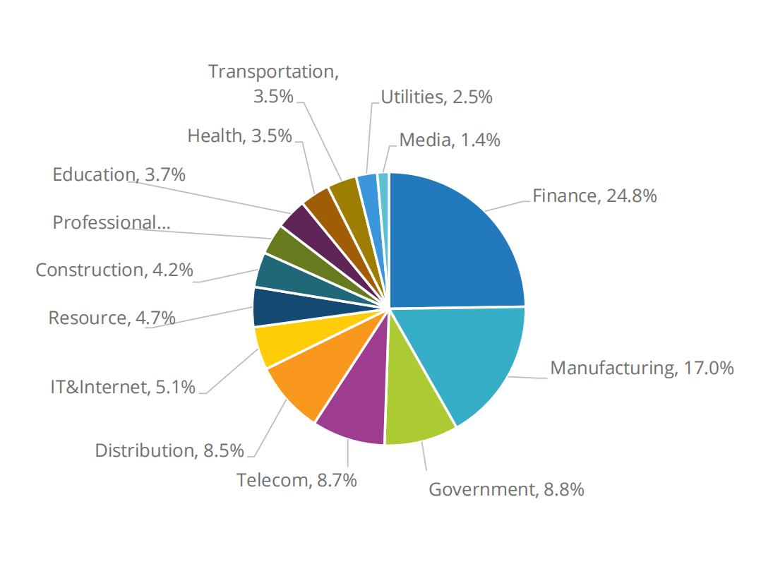 在2023年下半年,中国商业智能市场前五大行业为:金融、制造、政府、运营商、分销(批发/零售),总计占比67.8%。制造业在中国商业智能软件市场占比17.0%,制造行业企业数量众多,IT水平参差不齐。头部企业已经开始实践设备运维管理分析、物流和供应链优化等高级分析和预测分析能力,而大部分企业的需求还是集中在数据可视化层面。