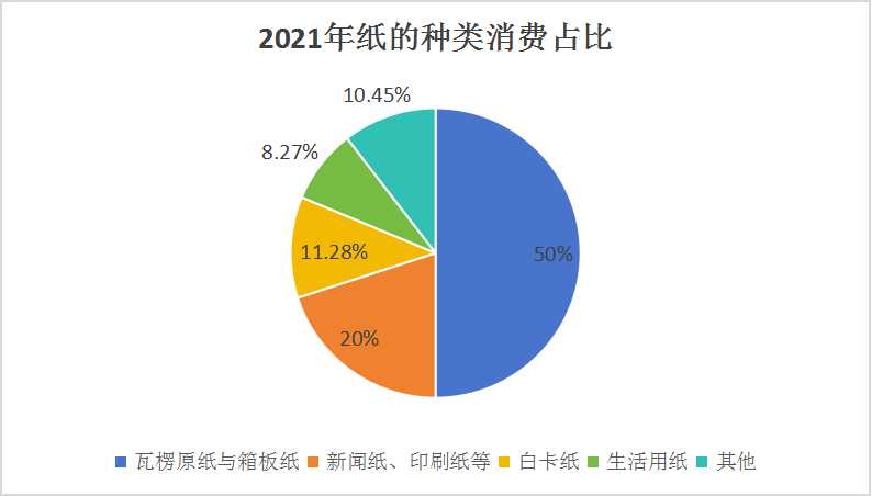 纸的种类众多,根据中国造纸协会2021年统计数据,瓦楞原纸和箱板纸都是用于生产瓦楞纸箱,消费占比接近一半;新闻纸、印刷纸等占比其次,合计约20%;白卡纸用途广泛,需求占比11.28%;生活用纸需求偏刚性,占比约8.27%。