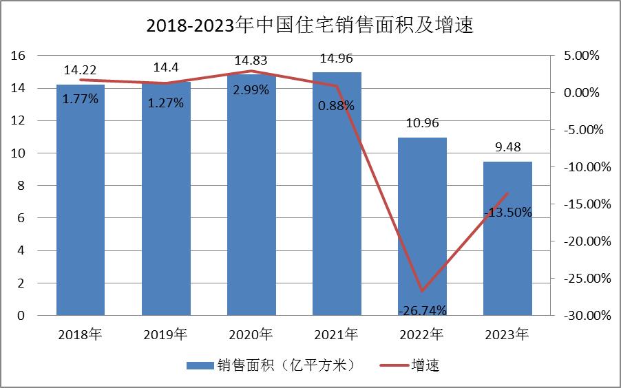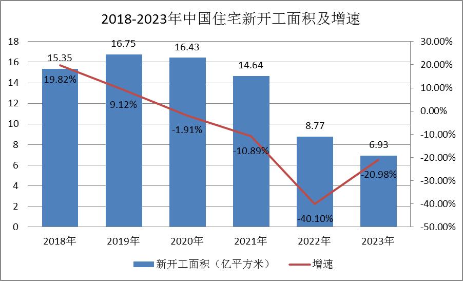 2023年,国内住宅新开工面积约6.93亿平方米,同比下降20.98%;销售面积约9.48亿平方米,同比下降13.50%;销售额约10.3亿元,同比下降9.41%。