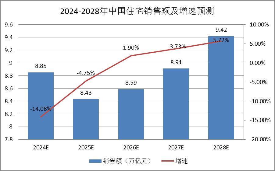 图表:2024-2028年中国住宅销售额及增速预测