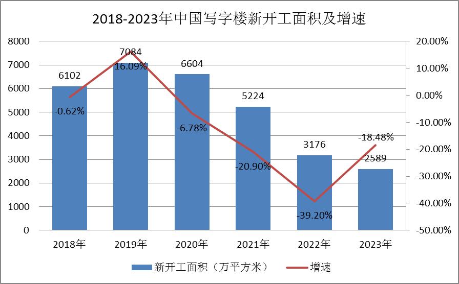 2023年,国内写字楼新开工面积约2589万平方米,同比下降18.48%;销售面积约2717万平方米,同比下降14.88%;销售额约3742亿元,同比下降16.27%。