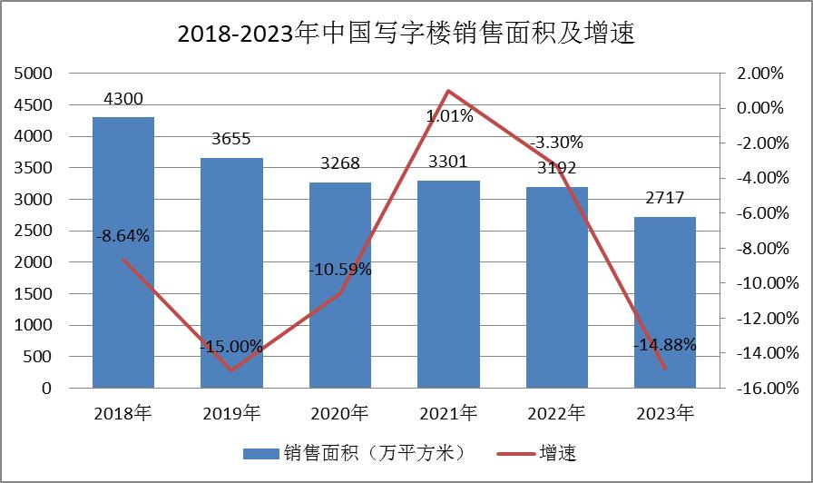 图表:2018-2023年中国写字楼销售面积及增速
