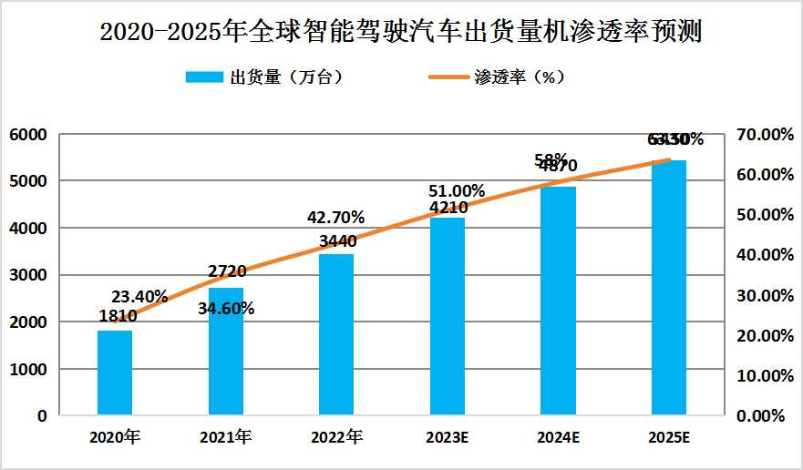 图表:2020-2025年全球智能驾驶汽车出货量机渗透率预测
