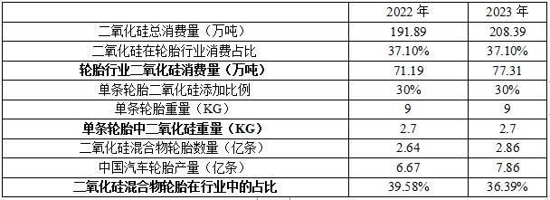 根据《中国橡胶工业年鉴》的数据,二氧化硅下游应用中,轮胎行业的消费占比约为37.10%;根据米其林公布数据以及市场调研情况,单条轮胎二氧化硅添加比例约为30%,单条轮胎的重量约为9KG(以半钢轮胎为例);根据中国橡胶工业协会轮胎分会的统计,2022年和2023年全国轮胎产量约6.67亿条和7.86亿条。根据以上数据测算,2022和2023年,我国二氧化硅混合物轮胎在行业中的占比分别为39.58%和36.39%。
