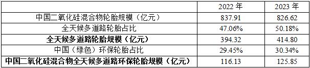 根据行业发展情况,结合橡胶工业协会专家访谈以及市场调研的结果,2023年我国二氧化硅混合物中,全天候多道路轮胎的市场占比约为50%左右。据此测算,2022年和2023年,我国二氧化硅混合物全天候多道路轮胎规模分别为394.32亿元和414.80亿元。