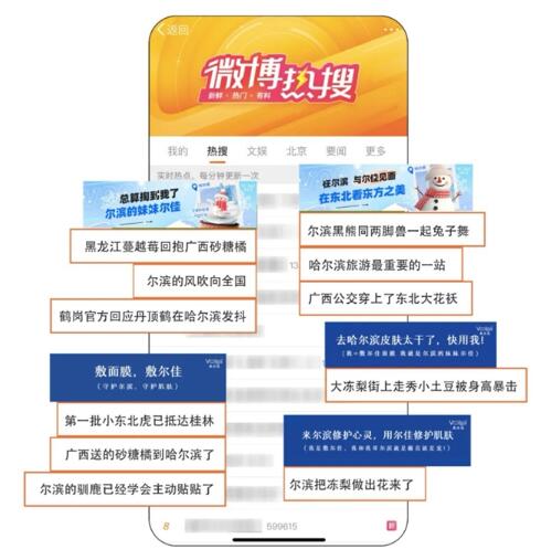 细节之处见真章,敷尔佳这波能够打动用户靠的正是这一点。据悉,在“尔滨”爆火期间,敷尔佳准备了多版传播素材,伴随不同类型、不同方向的热搜话题时,呈现的品牌物料采用了不同的巧思、不同的风格,从根本上形成了鲜明的差异化。
