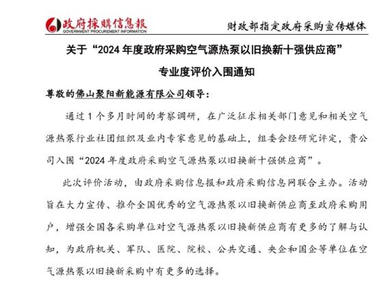8月9日,对于聚阳公司而言,是一个具有历史意义的日子。这一天,聚阳公司荣获了财政部指定政府采购信息报的入围通知,被评为2024年度空气源热泵以旧换新十强供应商。这一荣誉不仅是对聚阳公司实力的肯定,更是对其在新能源领域所取得成就的褒奖。