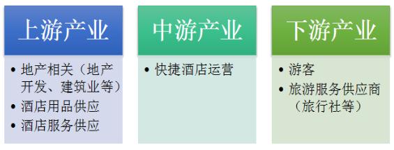 中国快捷酒店产业链上游主要包括地产开发、房屋设计、建材供应等地产相关供应商,洗漱用品、床单等酒店用品提供商,酒店系统软件、保洁人员培训等服务提供商等;产业链中游主要是各类档次快捷酒店运营商;下游主要包括个人以及旅游服务供应商等。