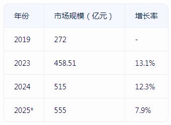 数据显示,中国洗衣液市场规模从2019年的272亿元增长至2023年的458.51亿元,年复合增长率达13.1%。2024年市场规模突破515亿元,预计2025年将保持7.9%的增速,向600亿元迈进(表1)。