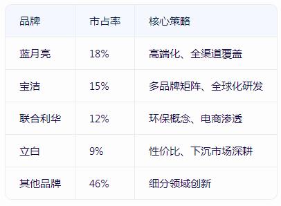 当前市场呈现“双超多强”格局:蓝月亮以14年连续市占率第一稳居龙头(2023年占比18%),宝洁(汰渍、碧浪)、联合利华(奥妙)紧随其后。前五大品牌合计市占率超60%,中小品牌通过差异化策略争夺剩余市场(表2)。