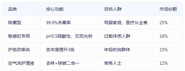 随着消费者对洗衣液功能、环保性、安全性等方面的要求不断提高,企业需要不断创新以满足消费者的多样化需求。例如,针对不同人群的特殊需求,洗衣液市场推出了婴儿洗衣液、内衣洗衣液等细分产品;同时,具有除菌、柔顺、护色等各种功能的洗衣液也受到消费者的青睐。