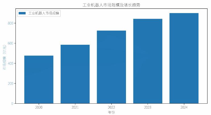 全球及中国工业机器人市场规模数据显示出市场的快速增长。2023年我国工业机器人市场销售额增长至725.38亿元,2024年进一步增长至842.62亿元。预计2025年,工业机器人市场规模将达到900亿元以上。