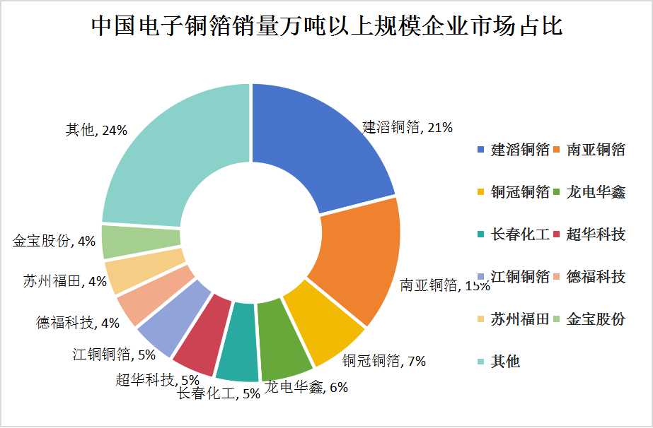 中国电子电路铜箔行业市场集中度较高。数据显示,电子电路铜箔销量在1万吨以上的企业有14家(另有说法为16家),其中销量在2万吨以上的企业有5家,分别是建滔铜箔、南亚铜箔、铜冠铜箔、龙电华鑫、长春化工。这5家企业的销量占比合计达到54%,显示出较高的市场集中度。