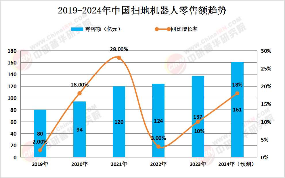 报告预测,2024年中国扫地机器人零售额有望达到161亿元。这一预测数据不仅反映了扫地机器人市场的快速增长,也预示着未来扫地机器人市场将继续保持强劲的增长态势。