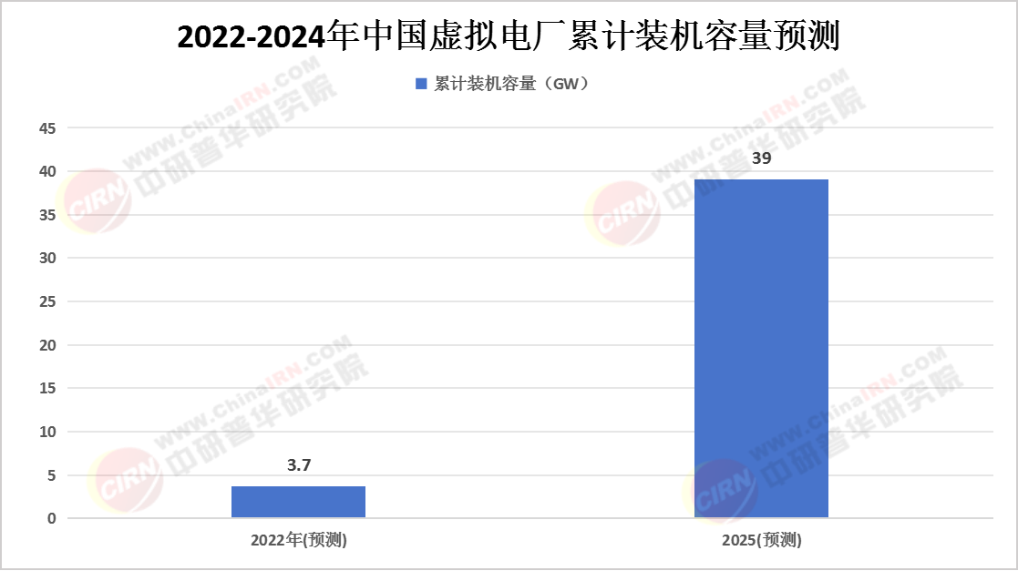 截至2022年,中国虚拟电厂项目累计装机容量约为3.7GW,占全球虚拟电厂装机总量的17.5%。这一数据表明,中国在虚拟电厂领域已经取得了显著的进展,并在全球市场中占据了一定的份额。随着技术的不断进步和市场的日益成熟,预计2025年中国虚拟电厂累计装机容量将达到39GW,实现大规模应用。