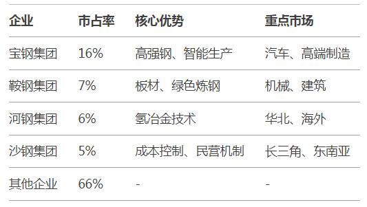 鞍钢集团:依托东北资源,聚焦板材市场,市占率7%,智能炼钢系统降低能耗15%。
