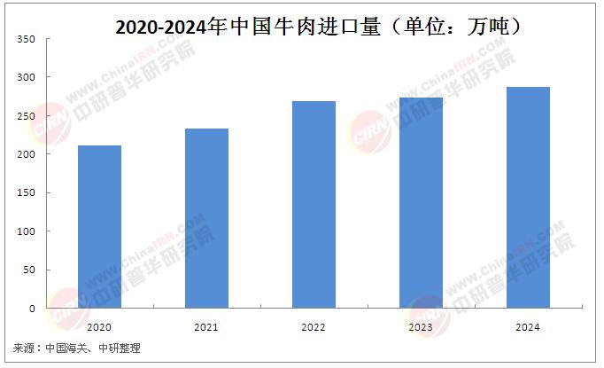 全球牛肉贸易格局中,中国已成为最大进口国,占全球进口量的近30%。2024年我国牛肉进口量依然呈现增长特点。根据海关统计,2024年中国大陆地区进出口牛肉约为287.5万吨,占国产牛肉的37%,牛肉进口量同比增长4.8%,牛肉进口金额约为974亿元,同比下降2.8%。