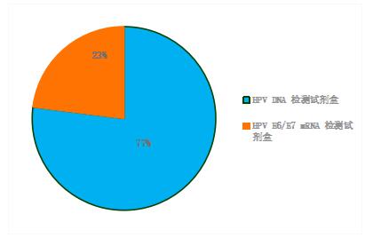 是目前市场上的主流产品,可分为不分型和全分型产品。不分型产品主要应用在两癌筛查领域;全分型产品主要用于医疗机构的辅助诊断。由于宫颈癌筛查市场需求大,HPV DNA检测试剂盒在整体HPV检测试剂盒市场中占比较高,约为77%。
