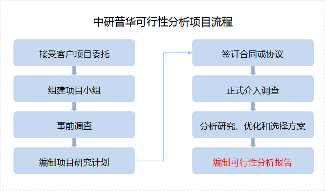 接受客户项目委托→组建项目小组→事前调查→编制项目研究计划→签订合同或协议→正式介入调查→分析研究、优化和选择方案→编制可行性分析报告