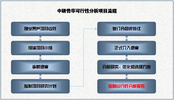 接受客户项目委托→组建项目小组→事前调查→编制项目研究计划→签订合同或协议→正式介入调查→分析研究、优化和选择方案→编制可行性分析报告