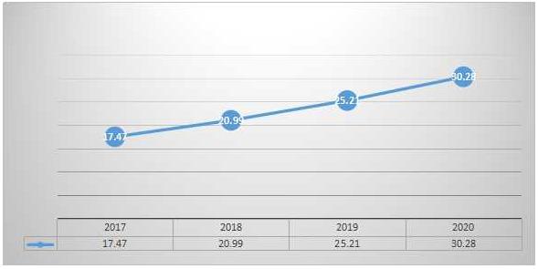 图表:2017-2020年中国多式联运货运量(单位:亿吨)