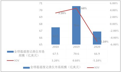 2018-2019年在新兴市场增量市场动能带动下,全球温湿度记录仪市场规模从2018年的67.5亿美元增长至2019年的70.6亿美元,增长幅度达到4.6%,2020年全球受新冠疫情影响,全球温湿度记录仪产业受生产停滞以及下游需求萎缩影响,市场规模萎缩至66.9亿美元,2020年较2019年回落5.1%。