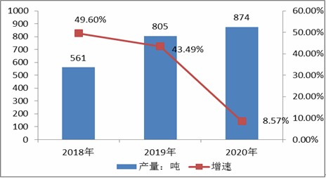 图表:2018-2020年高纯氮化硅行业生产总量及增速
