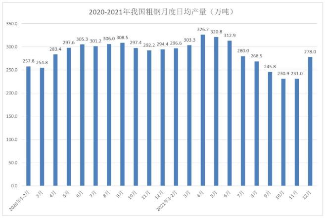 国家统计局公布的数据显示,2021年12月份我国粗钢产量为8619万吨,同比减少6.8%;日均粗钢产量为278.0万吨,环比大幅增长20.3%,同比下降5.5%,连续第六个月同比下降。2021年全年,我国累计生产粗钢103279万吨,同比下滑3.0%,累计产量连续第三个月同比下滑。